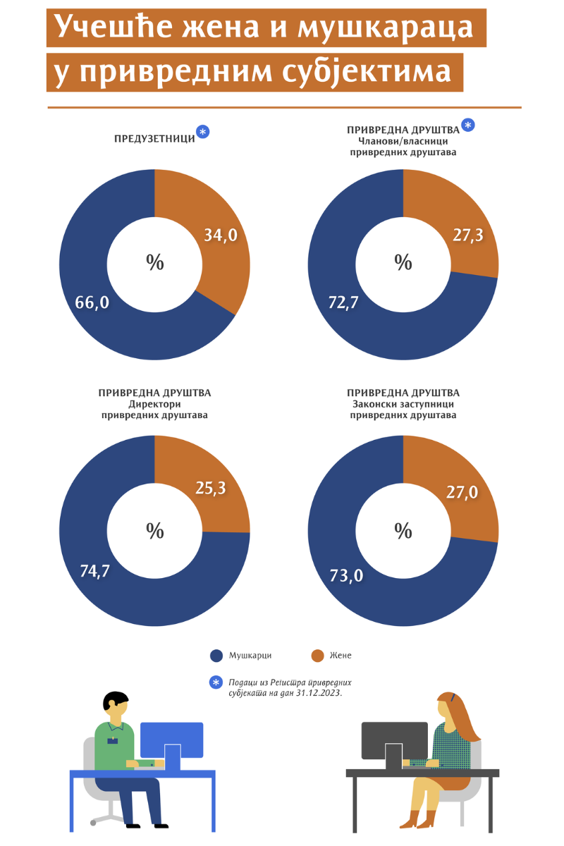 Na čelu privrednih društava registrovano je 2.597 žena koje obavlјaju direktorsku funkciju i one čine 25,30 odsto ukupnog broja direktora (10.253), dok je 29.649 žena registrovano na funkciji zakonskog zastupnika. Od ukupno 109.790 registrovanih zastupnika, žene čine udeo od 27,00%.