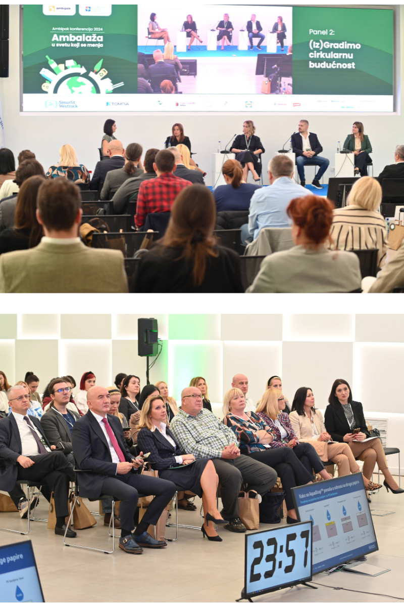 Na panelu "Izgradimo cirkularnu budućnost", Mihai je podelila pozitivna iskustva Rumunije i naglasila važnost transparentnih razgovora za uvođenje sistema u Srbiji. Tisa Čaušević iz Coca-Cole HBC Srbija predstavila je projekte održivosti, uključujući smanjenje CO2 i inovacije u ambalaži. Bojana Perić iz Ekostar Paka naglasila je potrebu za prilagođavanjem ciljeva lokalnim samoupravama i važnost stabilnih partnerstava za privredu. Tomislav Juričić, isped Smurfit Westrock-a govorio je o postizacnu cirkularnih ciljeva u proizvodnji papira za ambalažnu industriju i najavio još investicija u tom smeru u fabrici u Srbiji. Panel je moderirala Irena Lalić, urednica  Ambipak magazina.